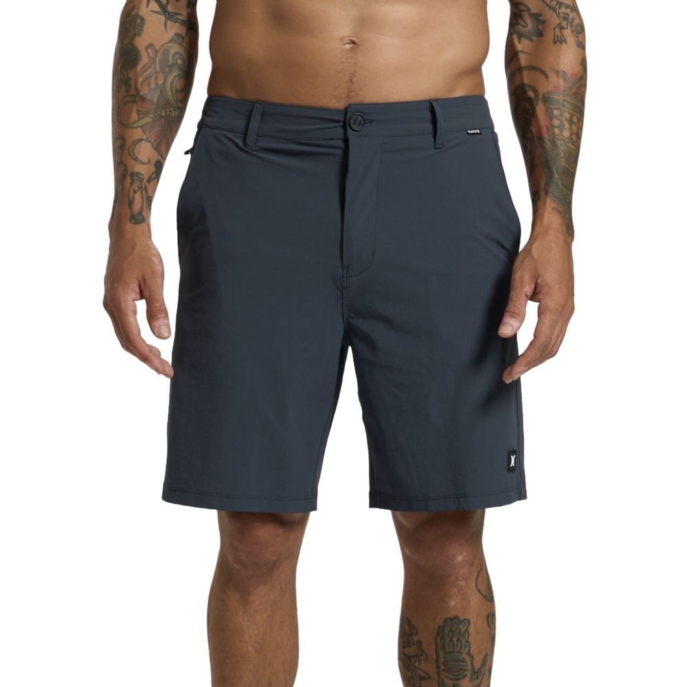 Bermuda Hurley com bolsos tipo "faca" nas laterais, bolso para celular com fechamento de zíper, etiqueta ONE&ONLY no cós, patch ICON de borracha na barra e etiqueta ONE&ONLY na pala traseira.
