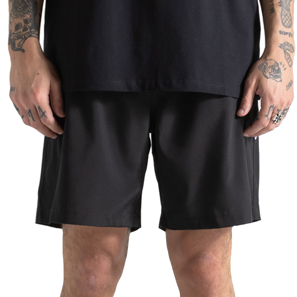 Bermuda Volcom com bolso faca lateral, bolso traseiro com lapela e etiqueta Volcom, elástico no cós, ajuste com cadarço e patch Volcom Stone lateral.