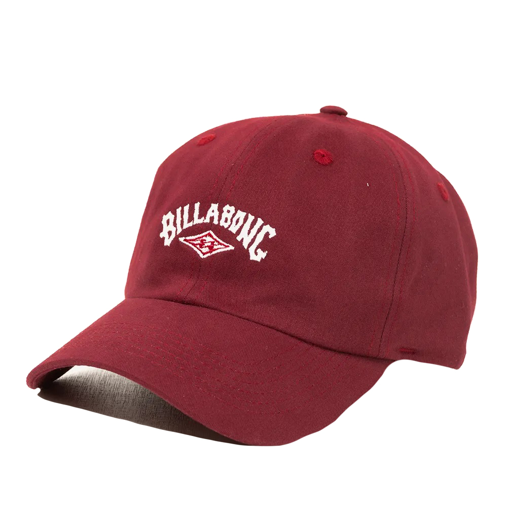 Boné Billabong desestruturado em modelagem 5Panels, tecido em sarja, possui aba curva e bordado frontal personalizado. Seu ajuste é com fivela metálica, e possui também etiquetas personalizadas.