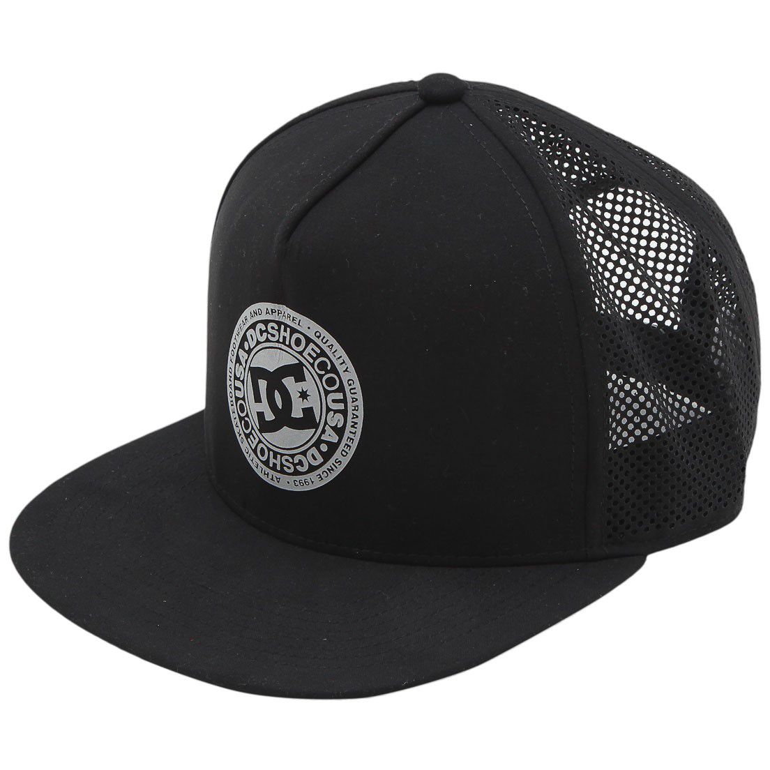 Boné estilo trcuker, aba reta, fechamento em snapback para ajuste personalizado e logo DC Shoes..