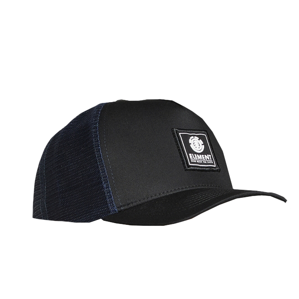 Boné Element trucker com aba curva, tela na parte traseira, patch personalizado na frente, fecho ajustável e etiquetas personalizadas.