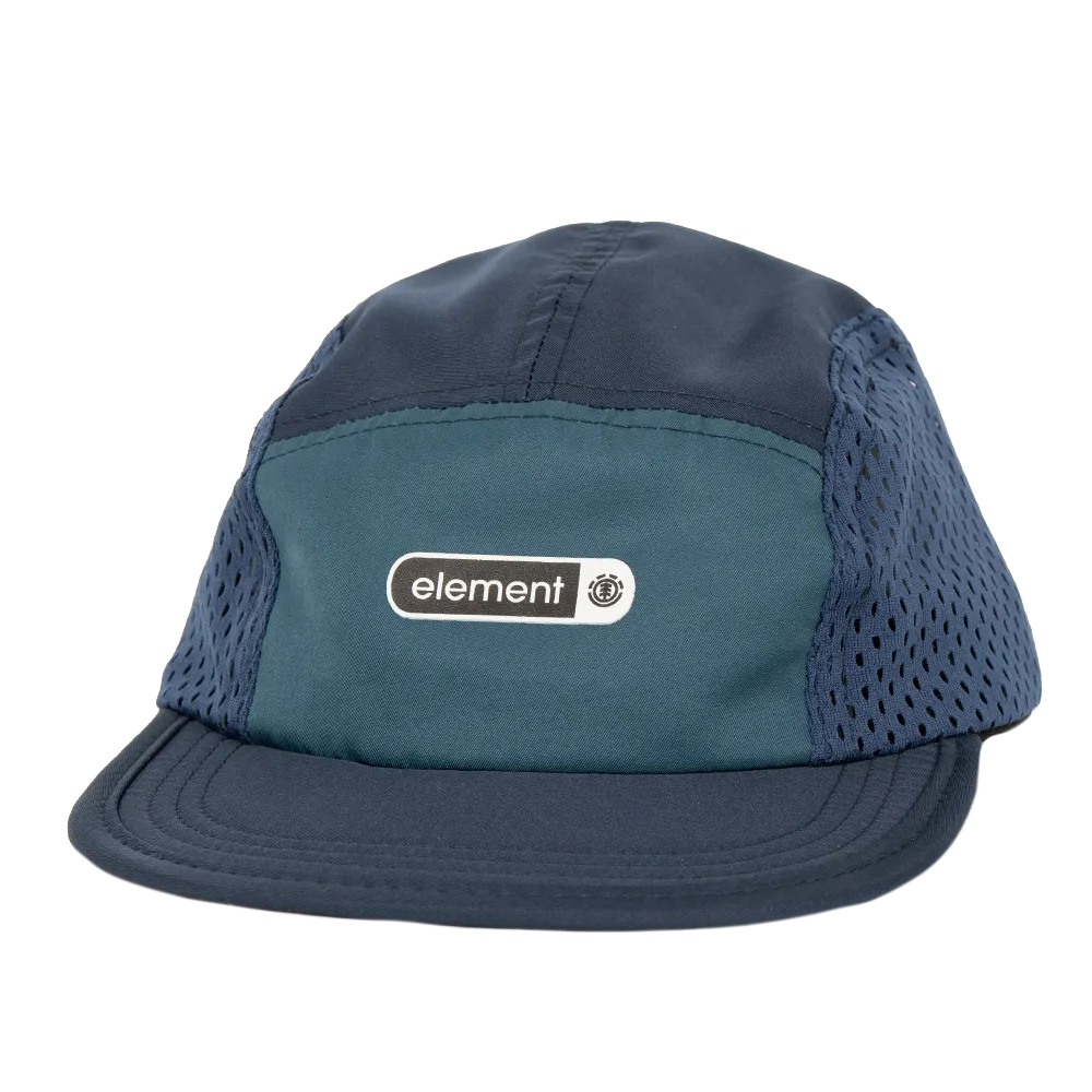 Boné Element feito em modelagem five panel, aba reta flexível, acabamento em viés com patch frontal aplicado no centro, lateral em mesh, parte traseira com strapback com fechamento com tiras duplas aderentes e etiquetas personalizadas.