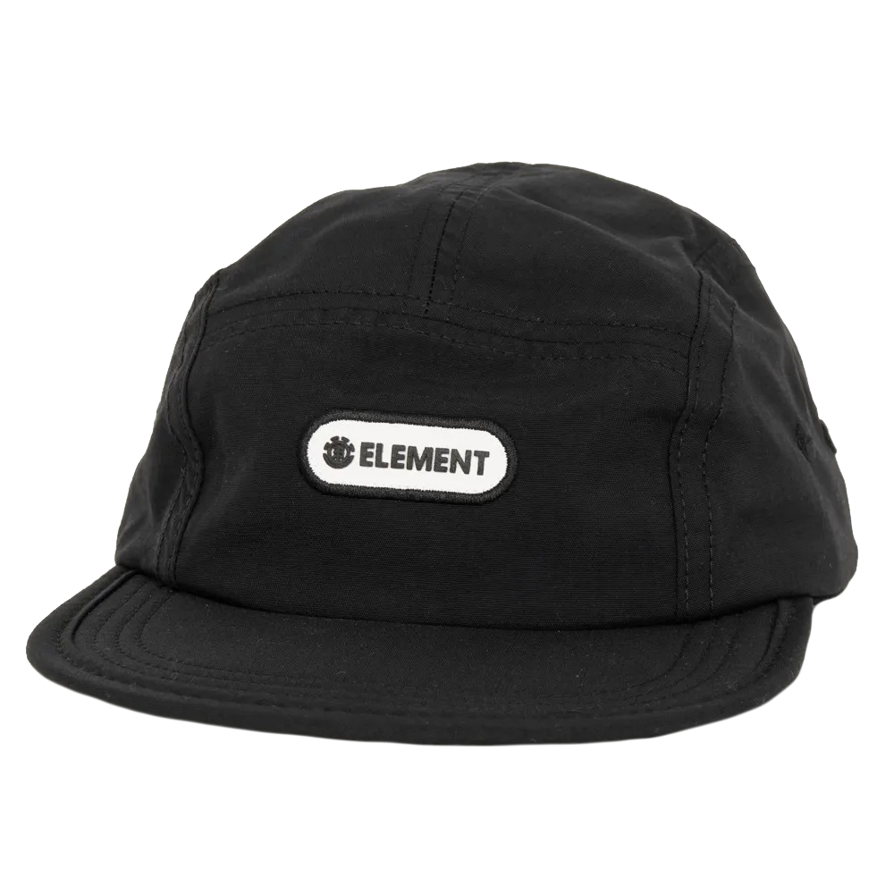 Boné Element feito em modelagem five panel, aba reta flexível, acabamento em viés, patch frontal aplicado no centro, parte traseira com strapback, fechamento com tiras duplas aderentes e etiquetas personalizadas.
