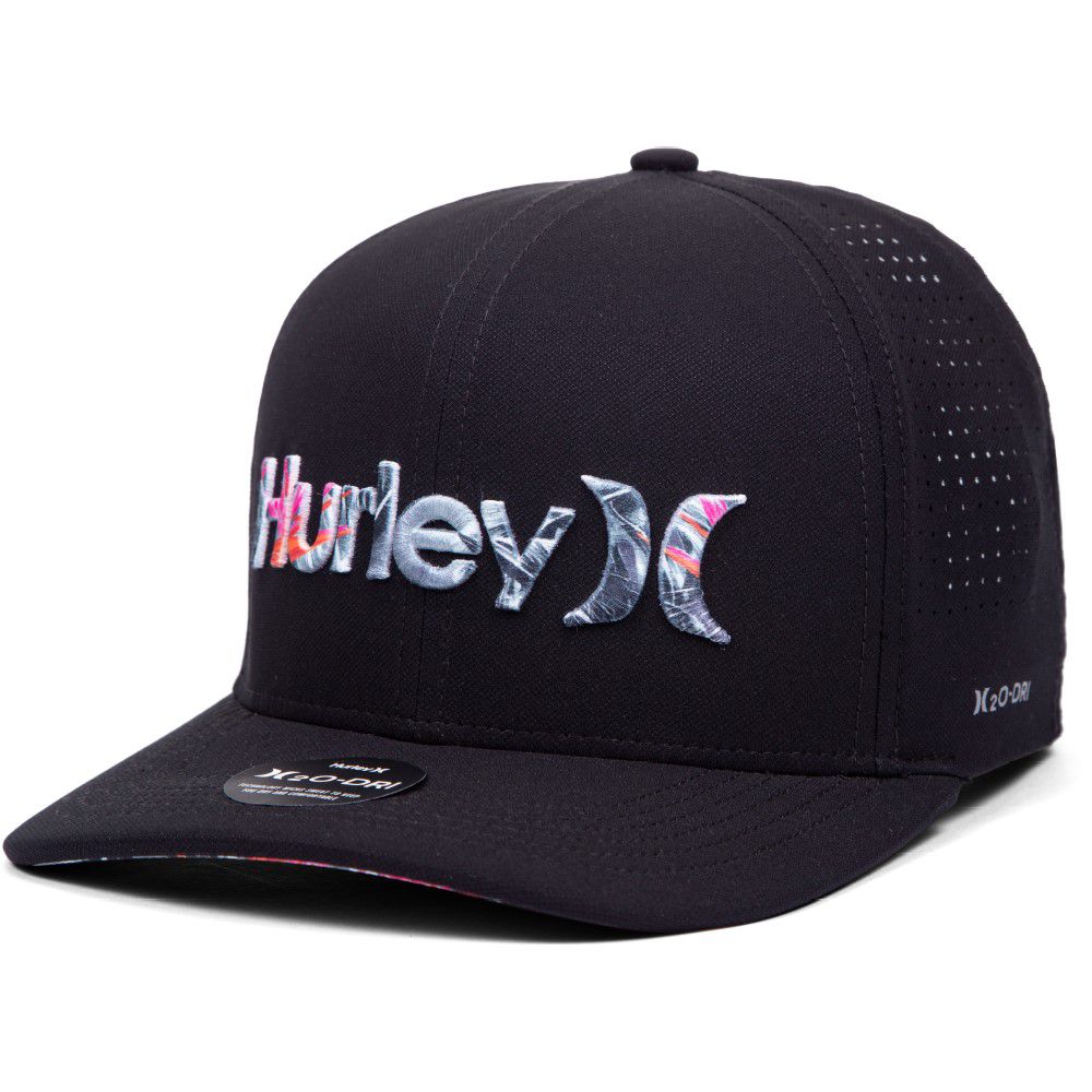Boné Hurley aba reta com a tecnologia H2O-DRI, com bordado One&Only 3D Sublimado, perfuração a laser nas laterais, Heat Transfer lateral refletivo e regulador traseiro.