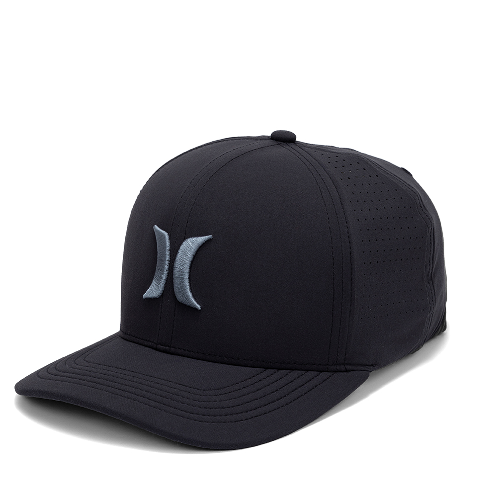 Boné Hurley feito em tecido com revestimento DWR que repele líquidos, bordado ICON 3D, aba inferior estampada, perfuração a laser nas laterais, heat transfer traseiro refletivo, bordado na parte traseira, regulador traseiro e etiqueta bandeira ONE&ONLY.