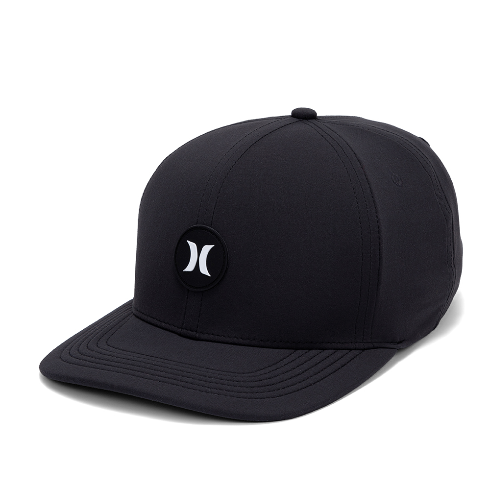 Boné Hurley feito em tecido com revestimento DWR que repele líquidos, patch borracha ICON, heat transfer traseiro refletivo, bordado na parte traseira, regulador traseiro e etiqueta bandeira ONE&ONLY.