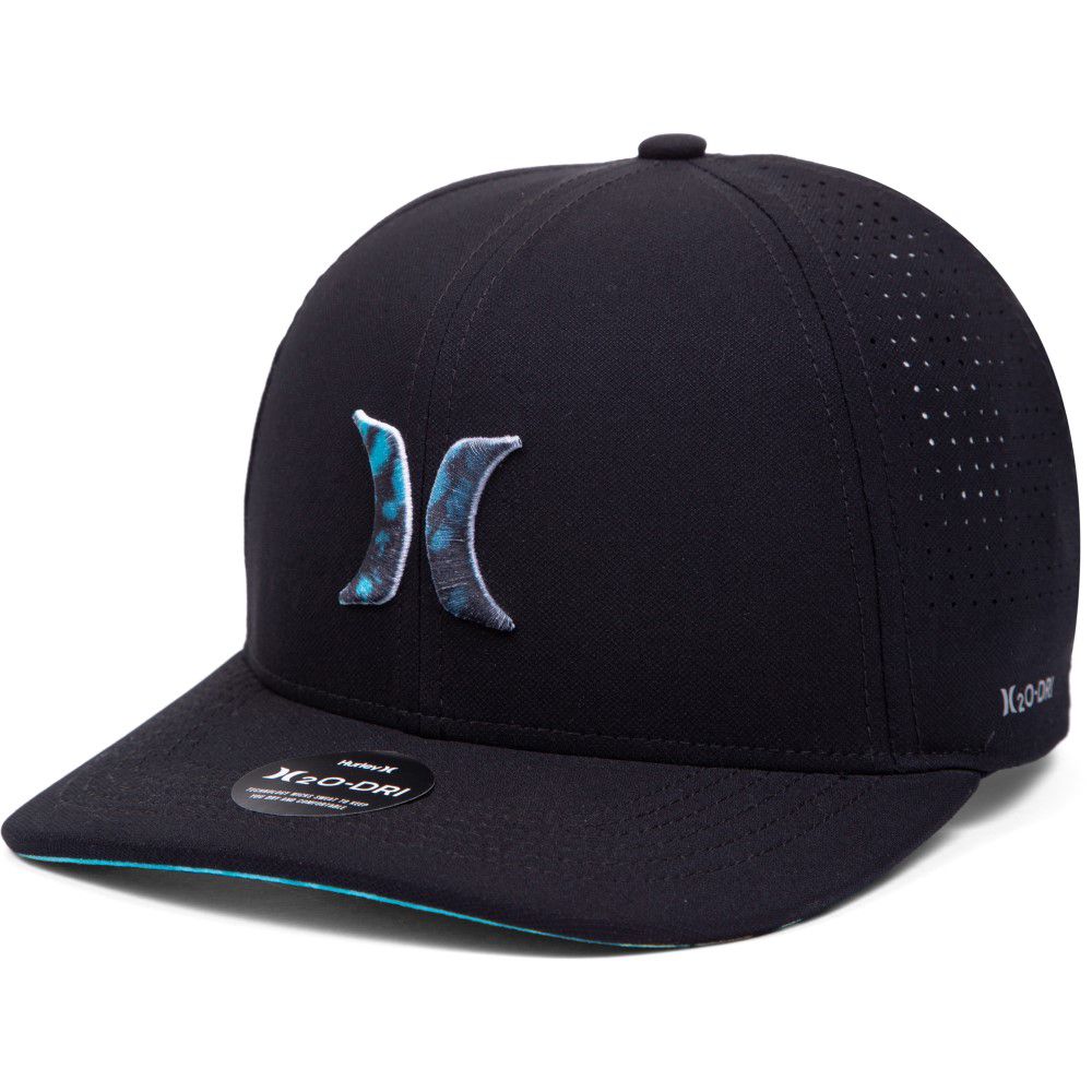 Boné Hurley com a tecnologia H2O-DRI, bordado ICON 3D sublimado, Heat Transfer lateral refletivo, aba inferior sublimada, perfuração a laser nas laterais e regulador traseiro.