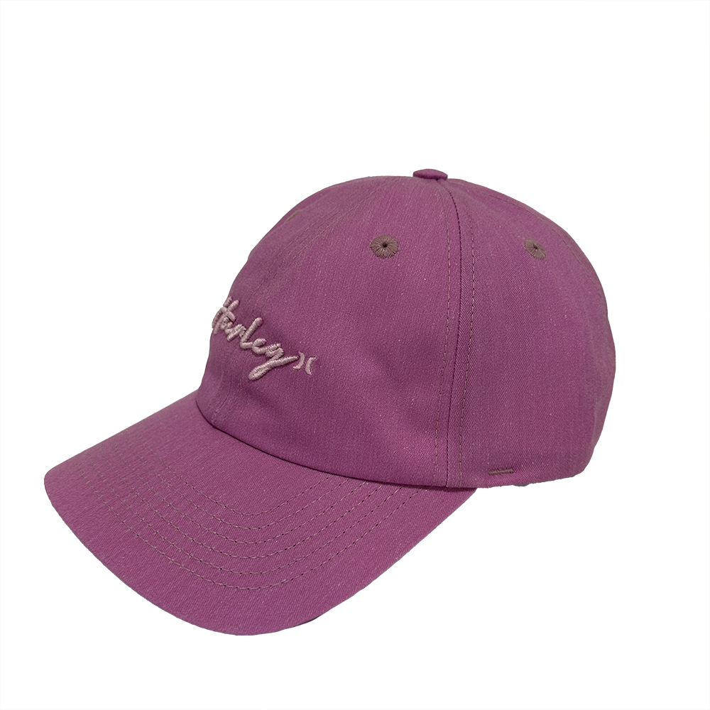 Boné Hurley com base desconstruída, bordado relevo, ilhós bordado, carneira de helança, regulador de "fita" V, etiqueta bandeira e etiquetas personalizadas.