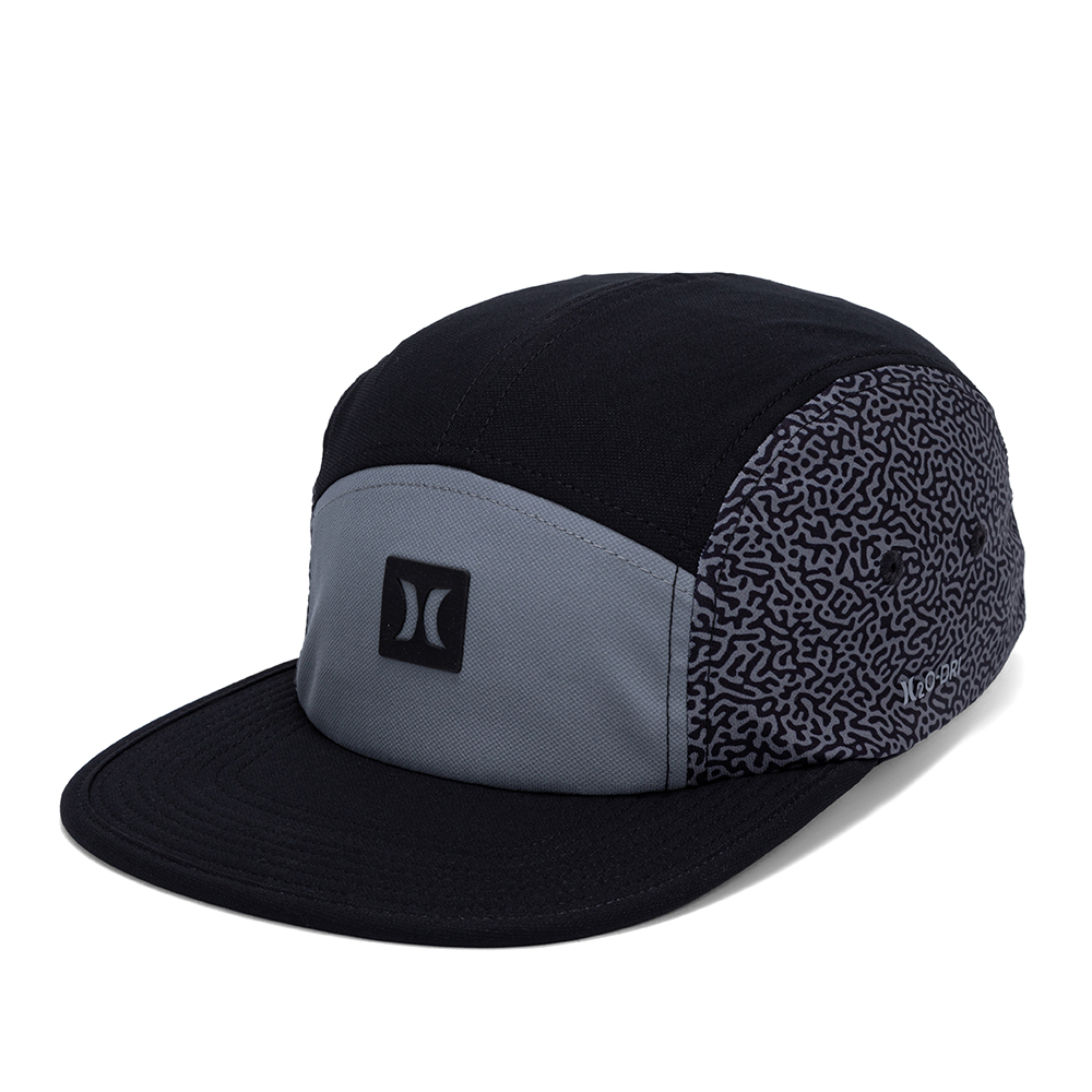 Boné Hurley feito em modelagem five panel, tecido leve com respirabilidade, aplique emborrachado, heat transfer lateral refletivo, lateral e aba inferior sublimadas, regulador traseiro e etiqueta bandeira ONE&ONLY.