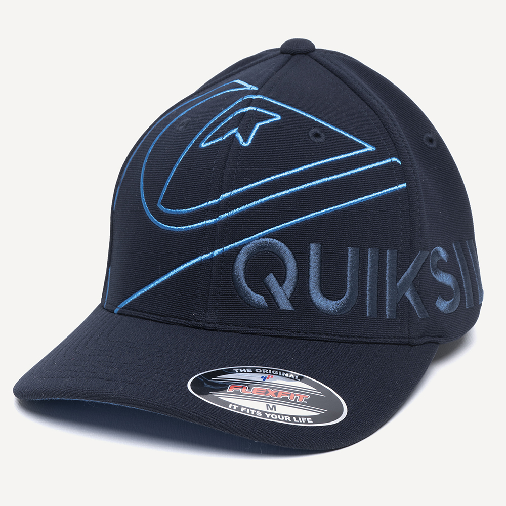 Boné QuikSilver feito em modelagem 6painel Flexfit, faixa anti suor por toda a circunferência interna, bordado assinatura aplicado na lateral frontal e bordado do logo no painel frontal, bordado FLEXFIT aplicado ao longo da lateral direita, aplicação de etiqueta na barra traseira e aba interna seguindo a cor do bordado.