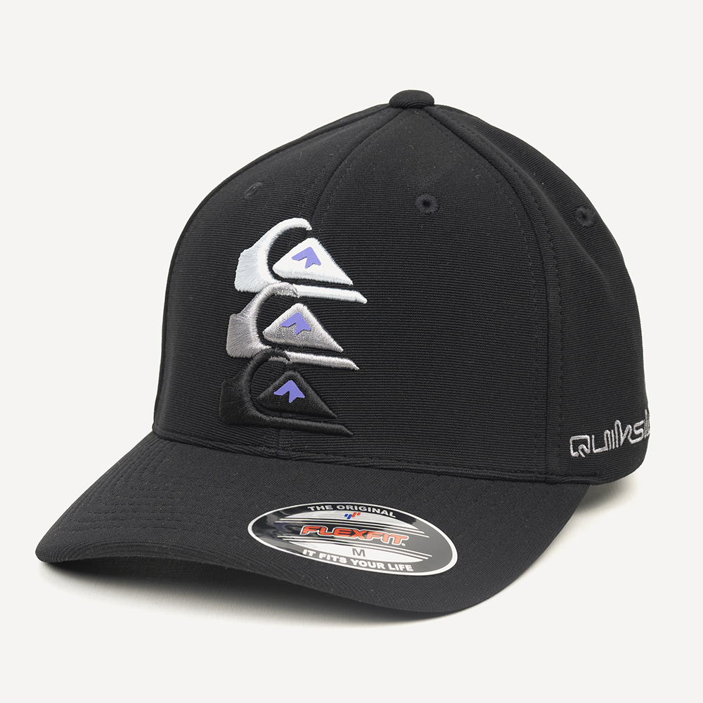 Boné QuikSilver 6 painel Flexfit, faixa anti suor na circunferência interna, bordado 3 logos em degradê com transfer contrastante aplicado no painel frontal, bordado FLEXFIT aplicado ao longo da lateral direita, aplicação de etiqueta na barra traseira e aba interna lisa contrastante.