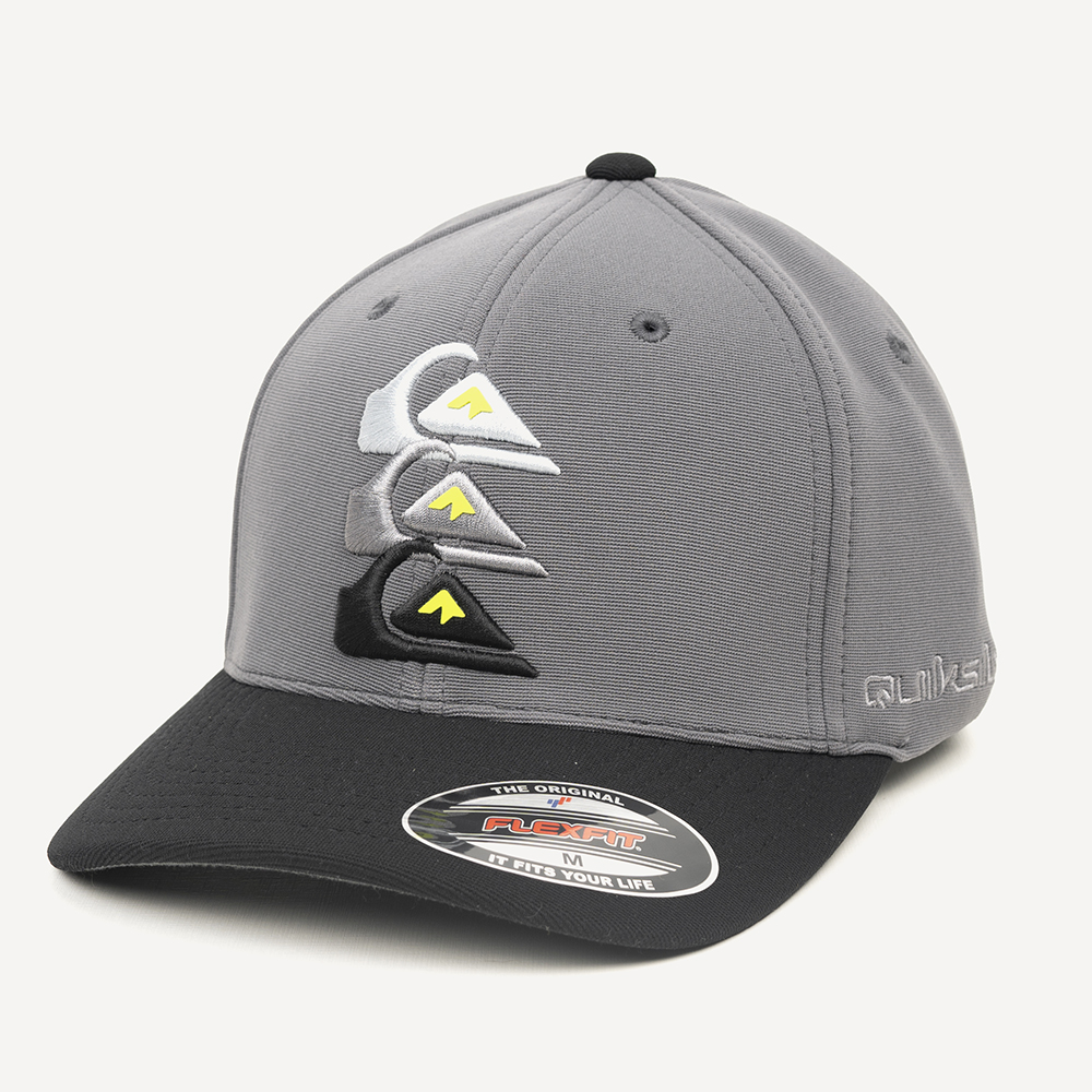 Boné QuikSilver 6 painel Flexfit, faixa anti suor na circunferência interna, bordado 3 logos em degradê com transfer contrastante aplicado no painel frontal, bordado FLEXFIT aplicado ao longo da lateral direita, aplicação de etiqueta na barra traseira e aba interna lisa contrastante.