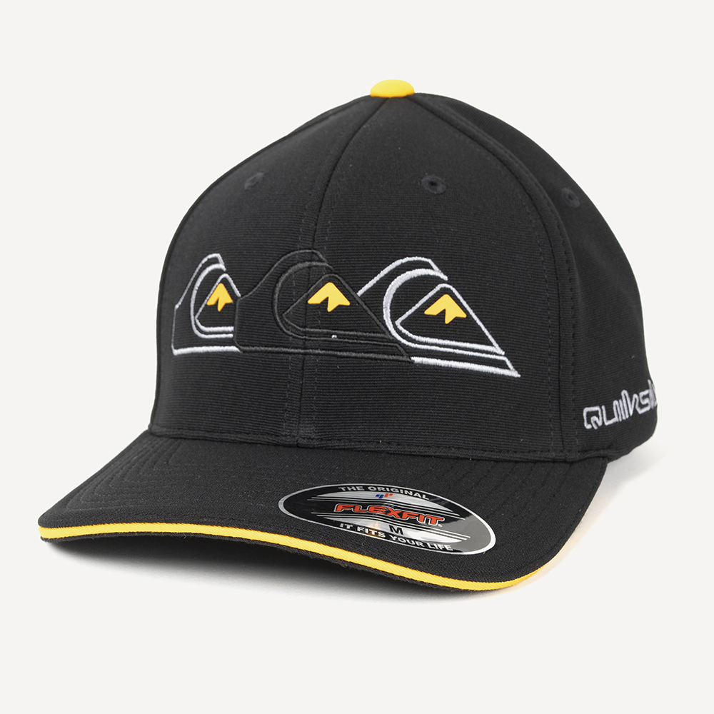 Boné QuikSilver 6 painel com detalhe contrastante na aba, bordado em relevo na frente, bordados nas laterais e etiqueta personalizada nas laterais.