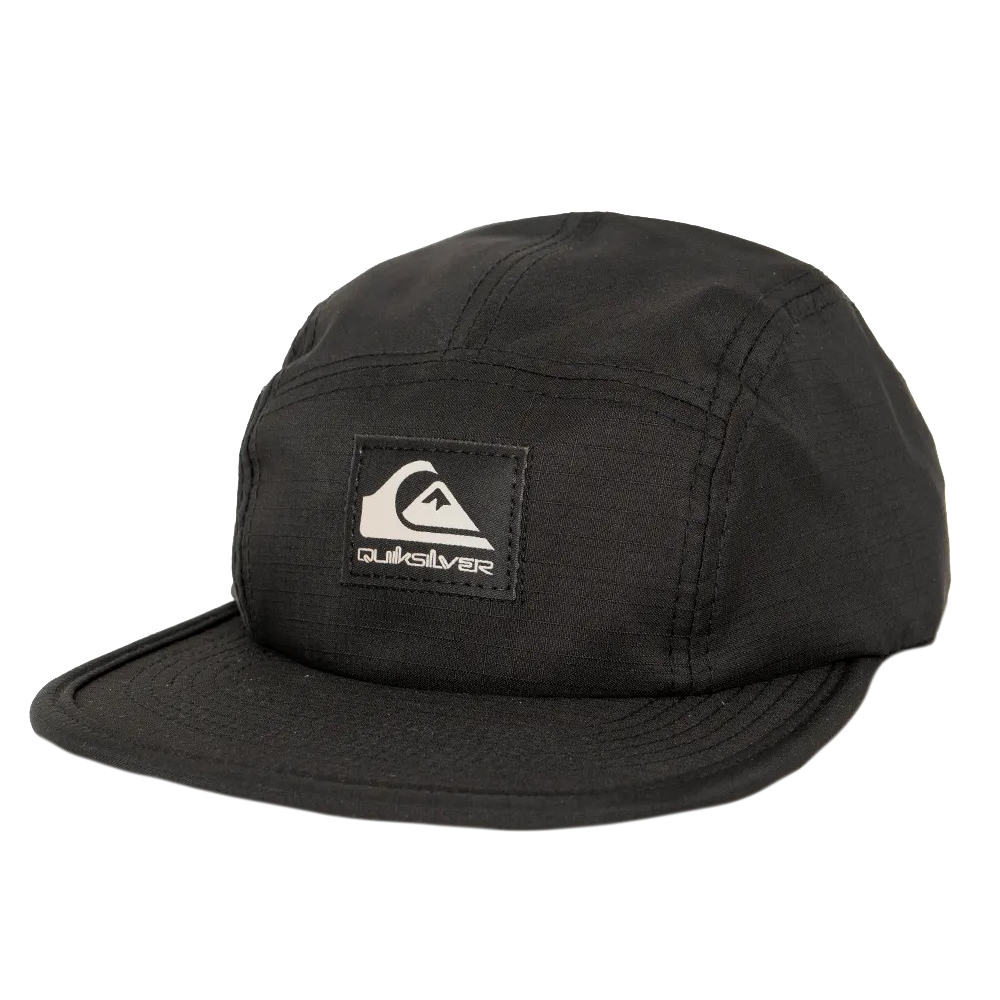 Boné QuikSilver feito em modelagem 5 panel em ribstop, aba reta, fechamento strapback, etiqueta centralizada frente e etiquetas personalizadas.