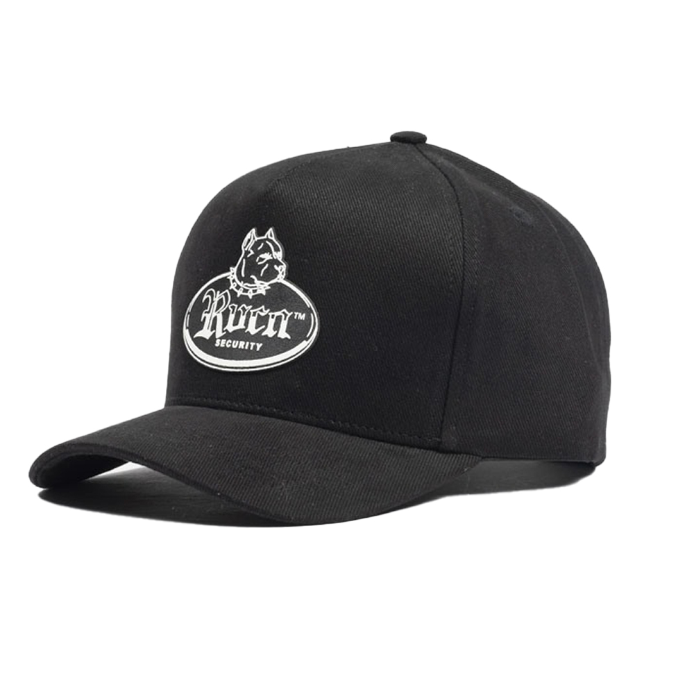 Boné RVCA em sarja de algodão, aba curva, estruturado, com estampa alto relevo frontal, regulador snapback plástico e etiqueta personalizada atrás.