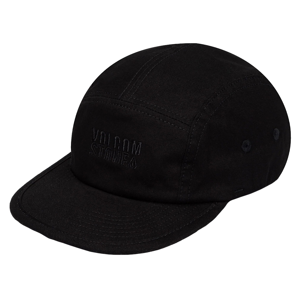 Boné Volcom feito em modelagem 5 panel, desestruturado, bordado sobretom frontal, ajuste traseiro com regulador e etiquetas personalizadas.