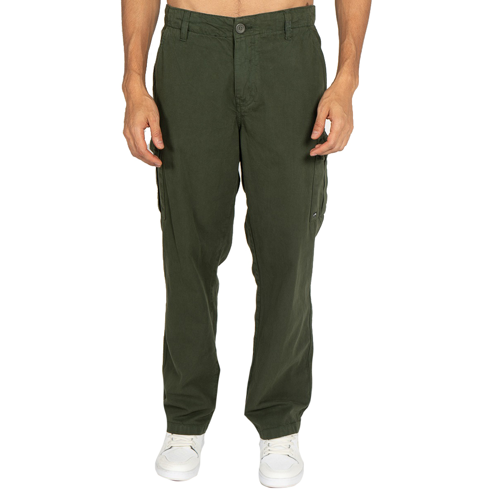 Calça Billabong cargo com fechamento em botão, bolsos faca frontais, bolsos traseiros embutidos e etiquetas personalizadas.