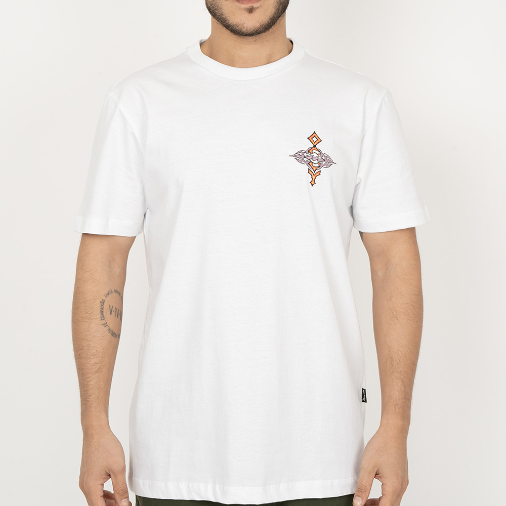 Camiseta Billabong feita em modelagem Core fit, meia malha, estampa aplicada na frente e costas e etiqueta da marca aplicada na lateral do lado esquerdo de quem veste.
