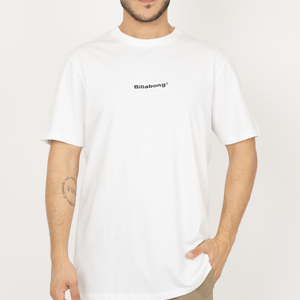 Camiseta Billabong feita em modelagem Core fit, meia malha de algodão, bordado 1 cor no peito e etiqueta personalizada.