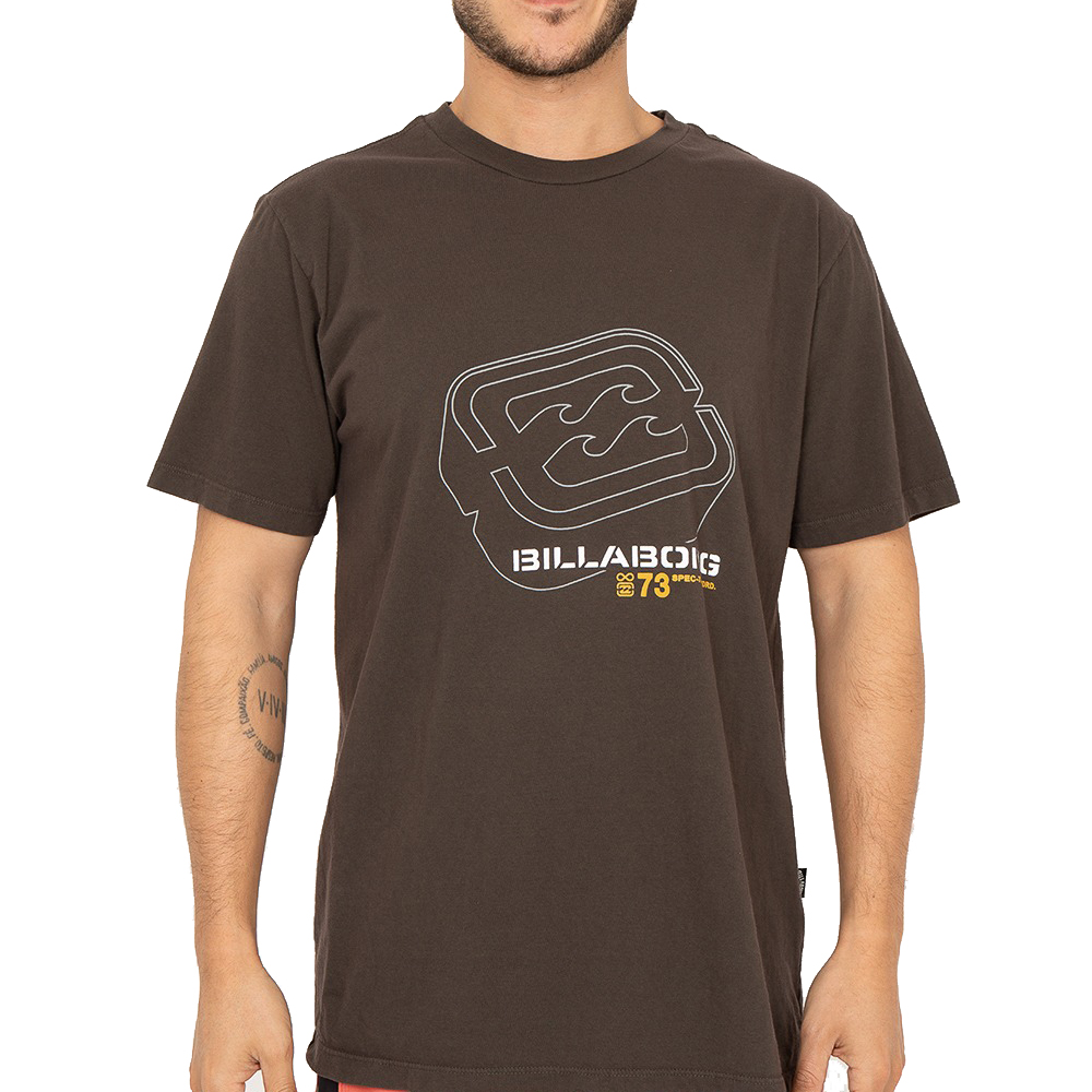 Camiseta Billabong feita em modelagem Corefit, meia malha, estampa aplicada na frente e etiqueta da marca aplicada na lateral lado esquerdo de quem veste.