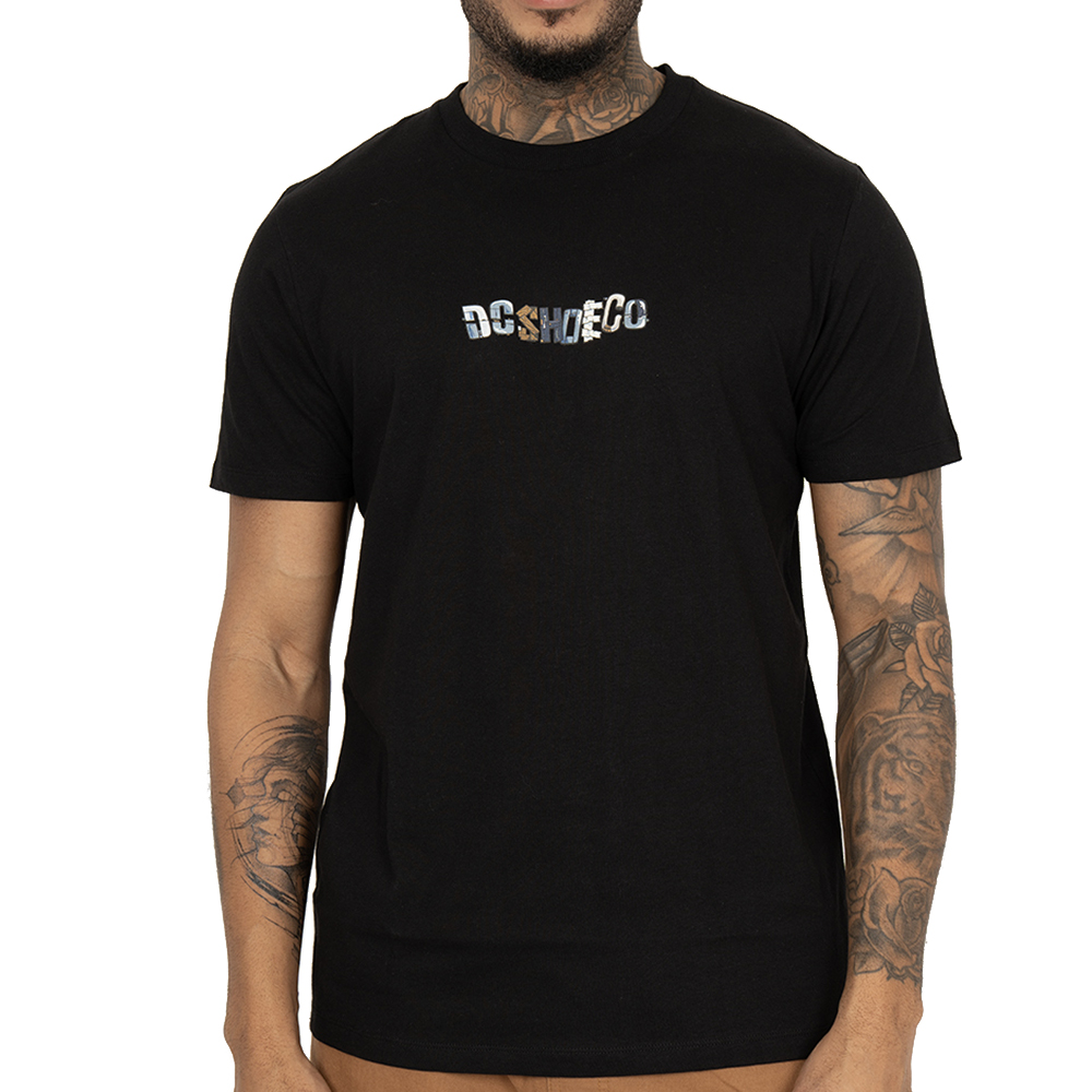 Camiseta Dc Shoes feita em modelagem regular, meia malha 30.1, estampa frente e costas e etiquetas personalizadas.