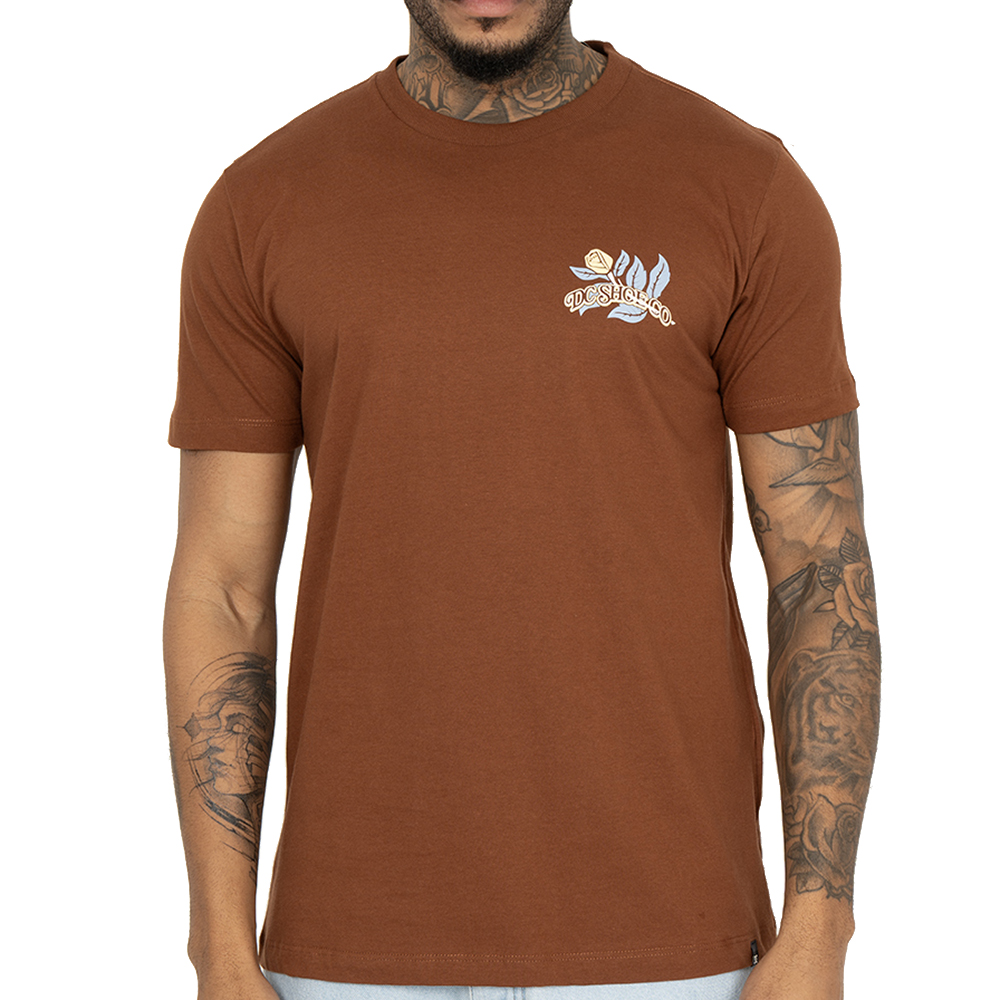Camiseta Dc Shoes feita em modelagem regular, meia malha 30.1, estampa frente e costas e etiquetas personalizadas.