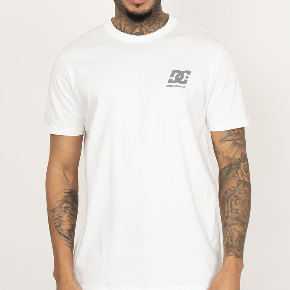 Camiseta Dc Shoes feita em modelagem regular, meia malha 30.1, estampa no peito em relevo e etiquetas personalizadas.
