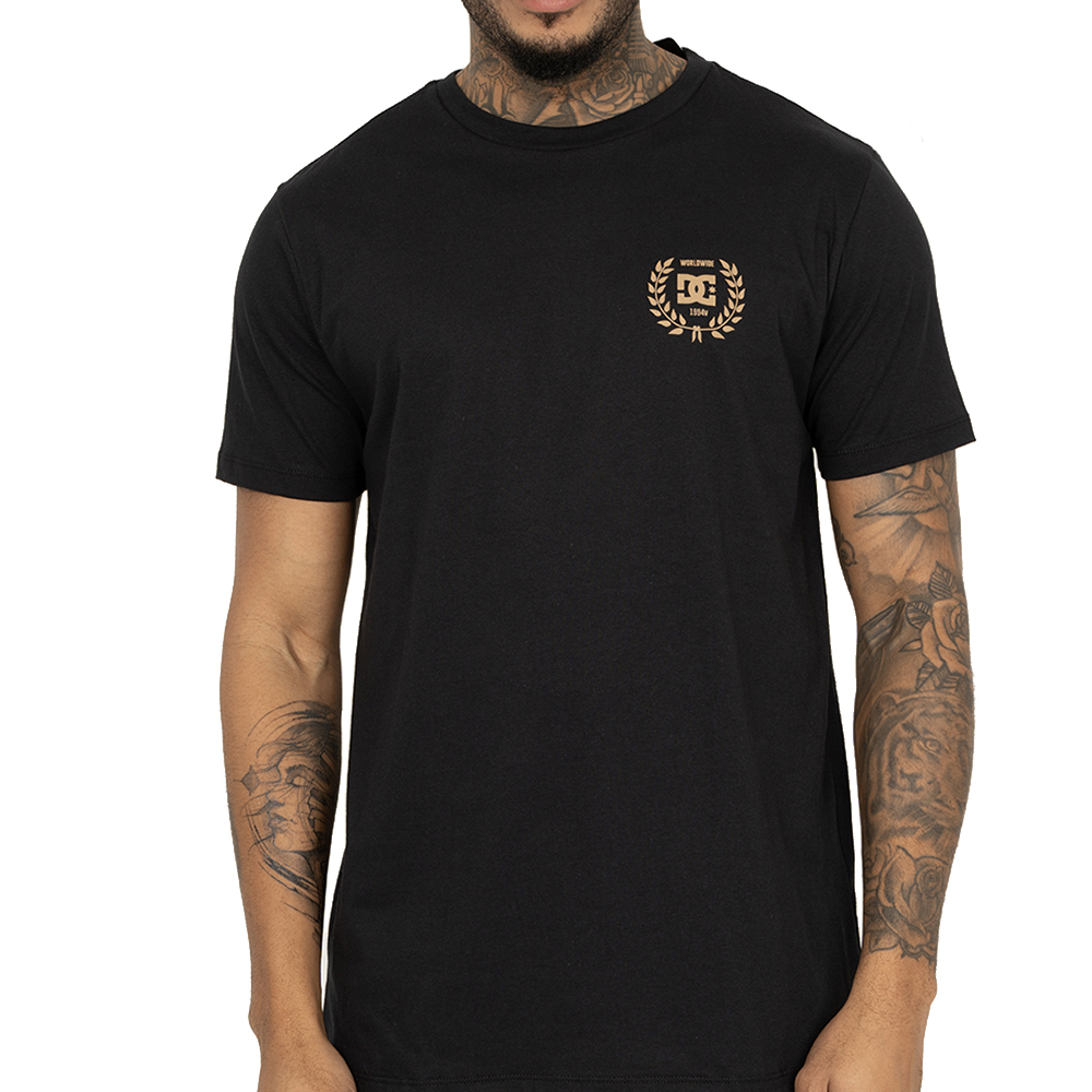 Camiseta Dc Shoes feita em modelagem regular, meia malha 30.1, estampa frente e costas e etiquetas personalizadas.