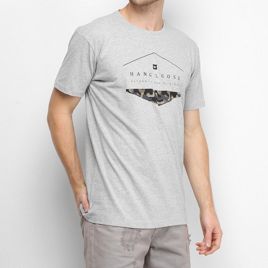 Camiseta Hang Loose meia malha, manga curta e com logo da marca na frente.