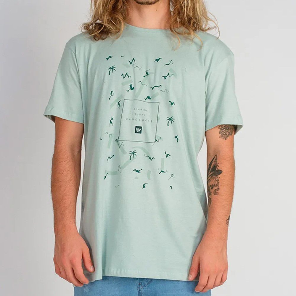 Camiseta Hang Loose meia malha, manga curta e com logo da marca na frente.