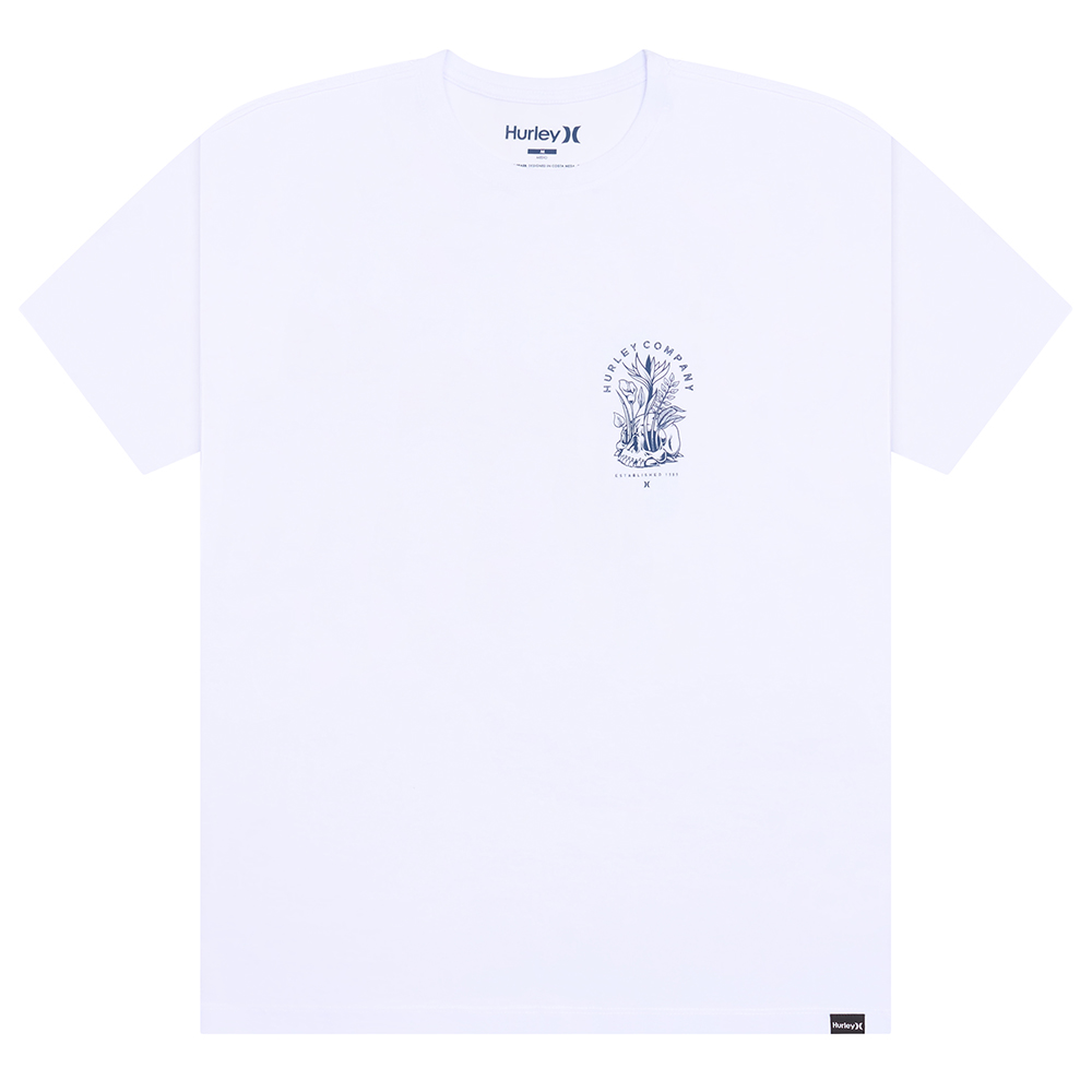 Camiseta Hurley feita em meia malha 30.1, gola rebatida, estampa localizada base d'agua e etiqueta clips ONE&ONLY na barra.