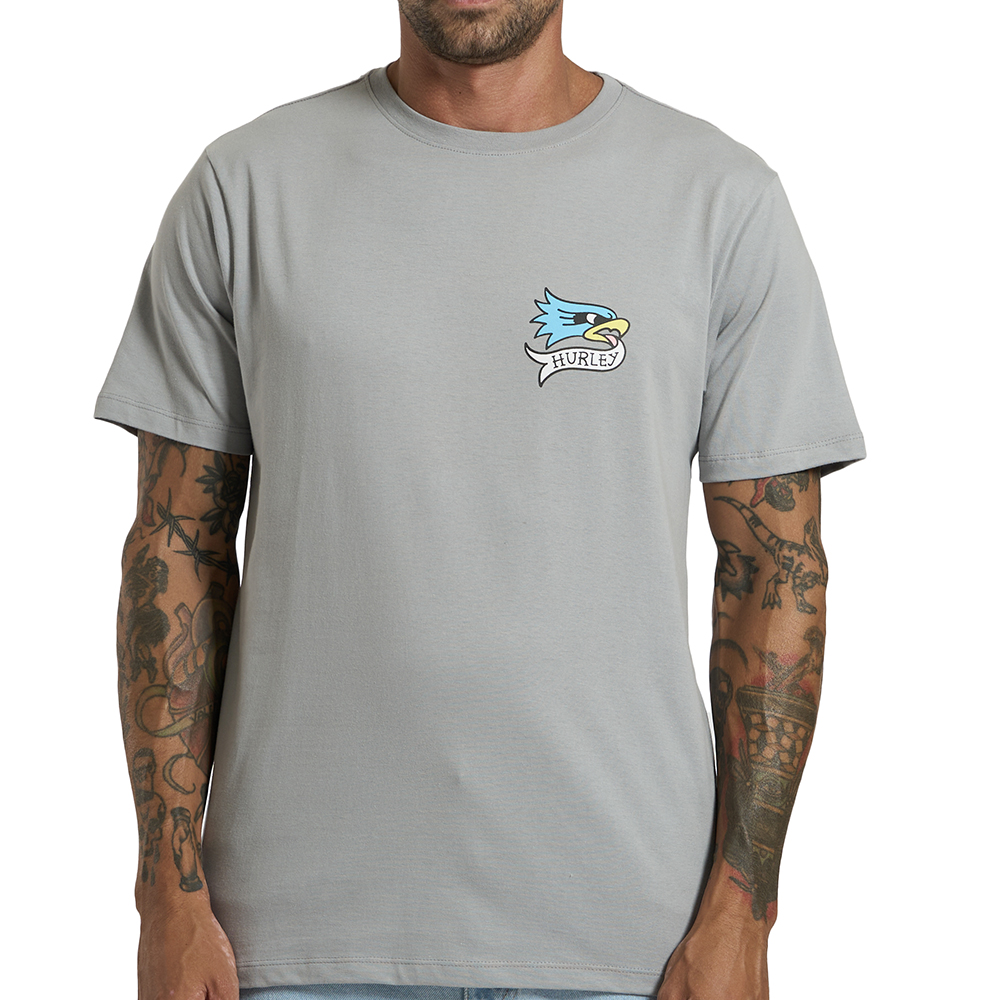 Camiseta Hurley feita em meia malha 30.1, gola rebatida, estampa localizada base d'agua e etiqueta clips ONE&ONLY na barra.