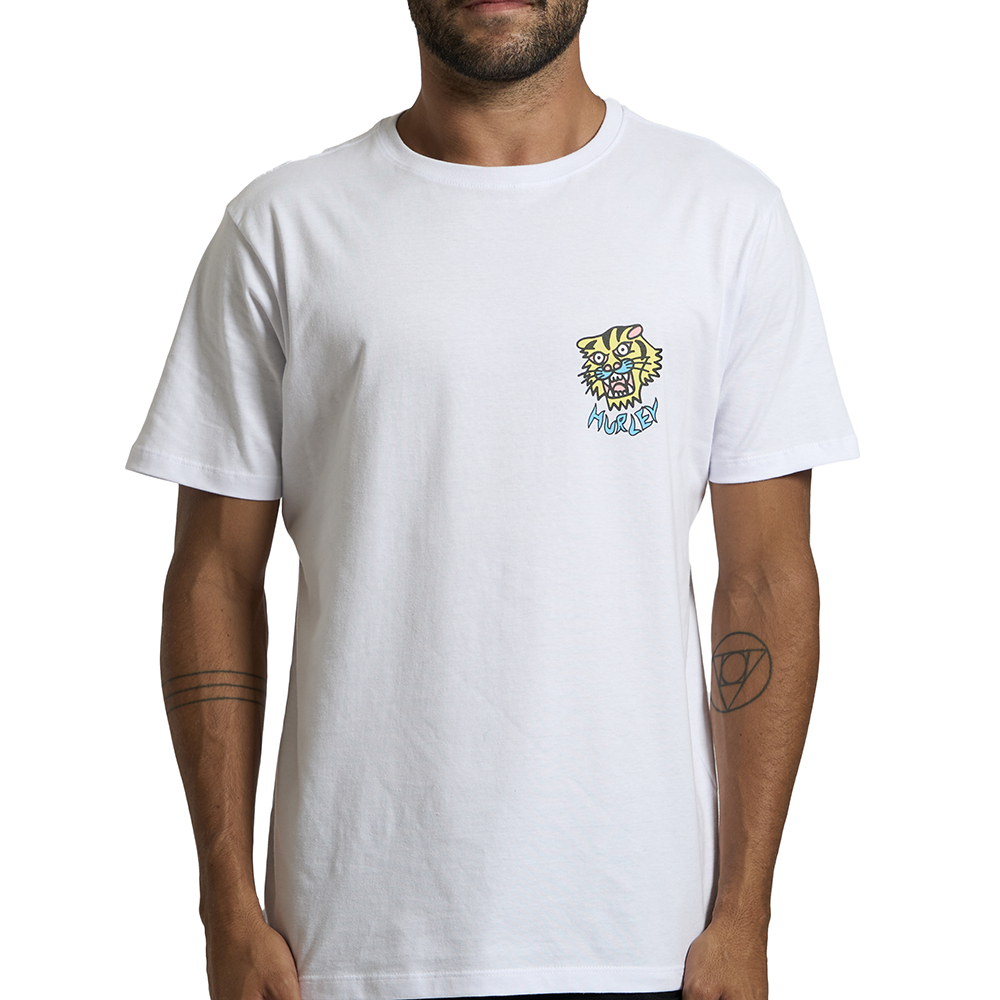 Camiseta Hurley feita em meia malha 30.1, gola rebatida, estampa localizada base d'agua e etiqueta clips ONE&ONLY na barra.