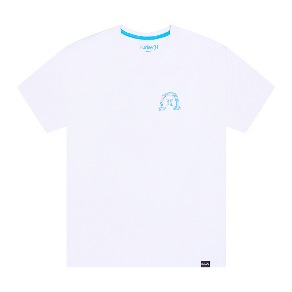 Camiseta Hurley feita em meia malha 30.1, gola rebatida, estampa localizada base d'agua e etiqueta clips ONE&ONLY na barra.