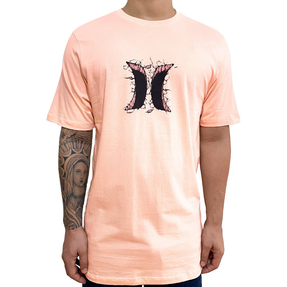 Camiseta Hurley feita em meia malha 30.1, gola rebatida, estampa localizada base d'agua e etiqueta clips ONE&ONLY na barra.