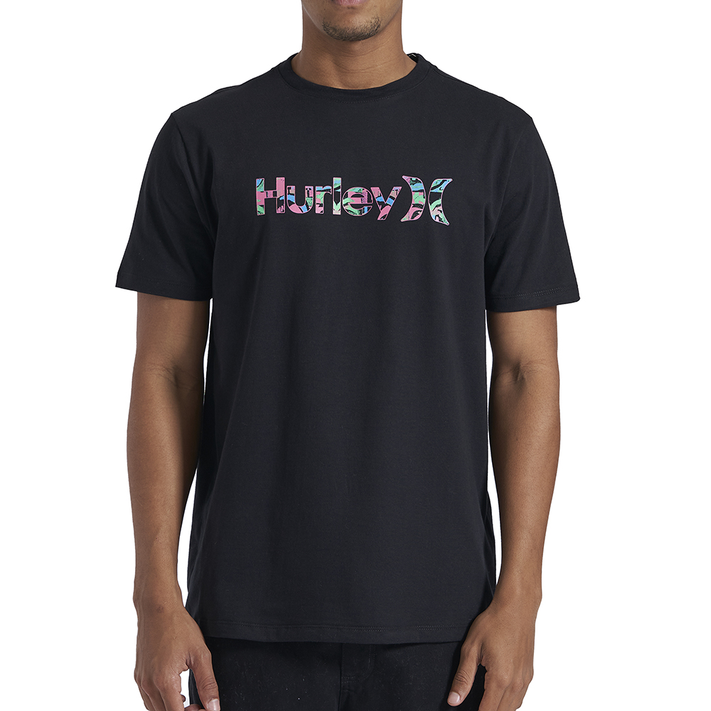 Camiseta Hurley feita em meia malha 30.1, gola rebatida, estampa localizada base d'agua e etiqueta clips ONE&ONLY na barra.