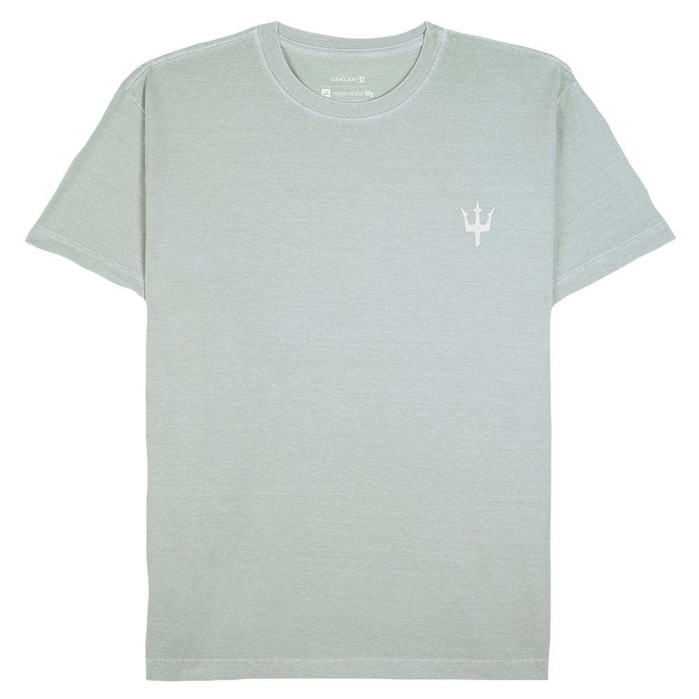 Camiseta Osklen T-Shirt masculina 1/2 malha 100% algodão certificado, base de modelagem Regular, visual lavado, gastinha. A produção do algodão nacional certificado contribui para redução dos impactos ambientais, utiliza energia renovável, reduz o consumo de água e fomenta o aprimoramento social e ambiental das cadeias produtivas brasileiras. Bandeira Regenerate Life.