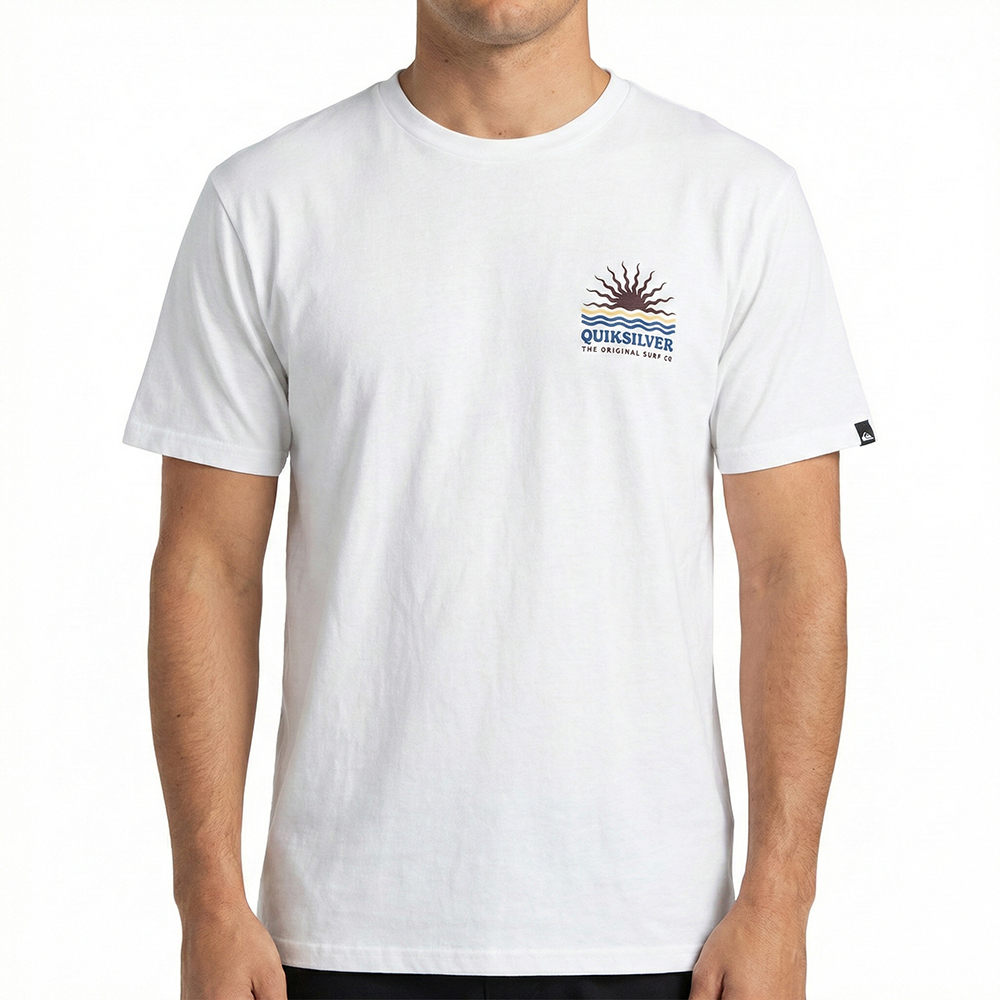 Camiseta QuikSilver feita em modelagem regular, meia malha penteada, estampa frente e costas e etiquetas personalizadas.