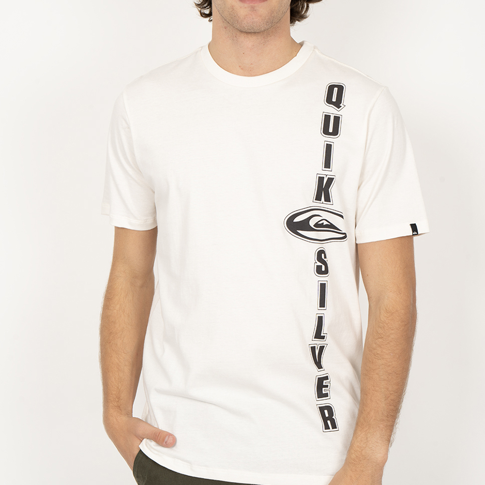 Camiseta QuikSilver feita em modelagem regular, meia malha, estampa aplicada no comprimento vertical frente e etiqueta da marca aplicada próximo a barra do lado esquerdo de quem veste.