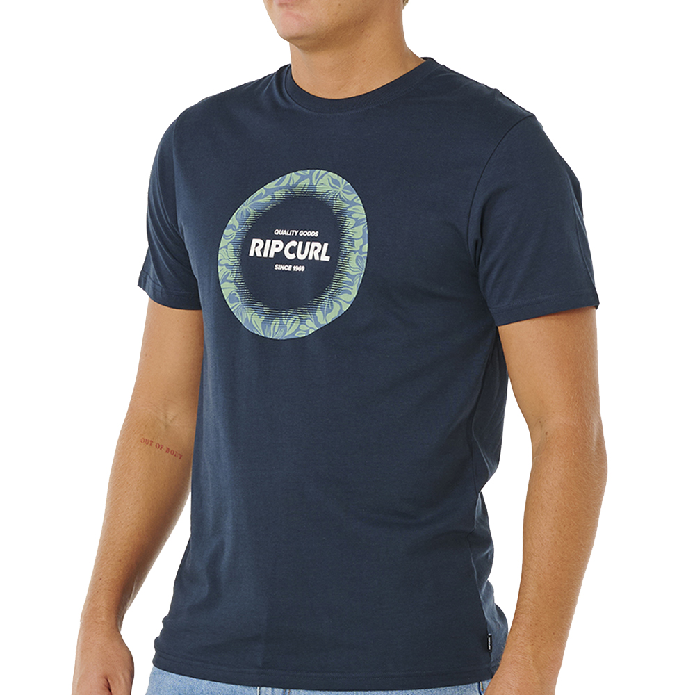 Camiseta Rip Curl feita em modelagem relaxed fit, meia malha 26.1, estampa frente e etiquetas personalizadas.