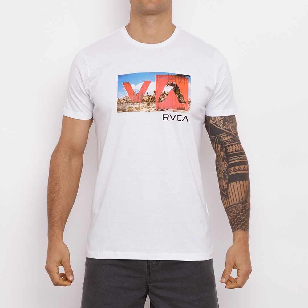 Camiseta meia malha de 30.1 de algodão, modelagem regular e estampa silk logo RVCA frente e costas.