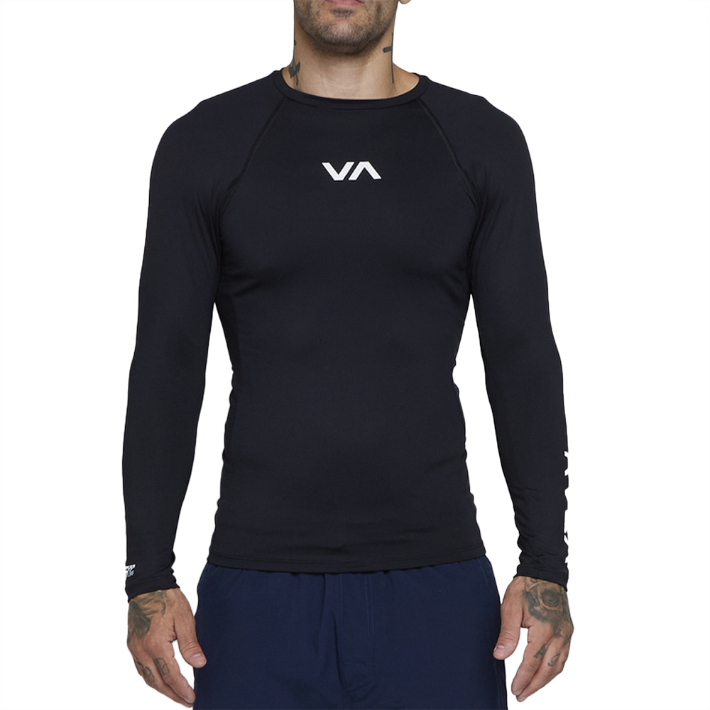 Camiseta Rvca Surf feita em modelagem manga longa raglan, proteção UV 50+, estampas na frente e manga, estampa de tamanho no interno e tag personalizado.