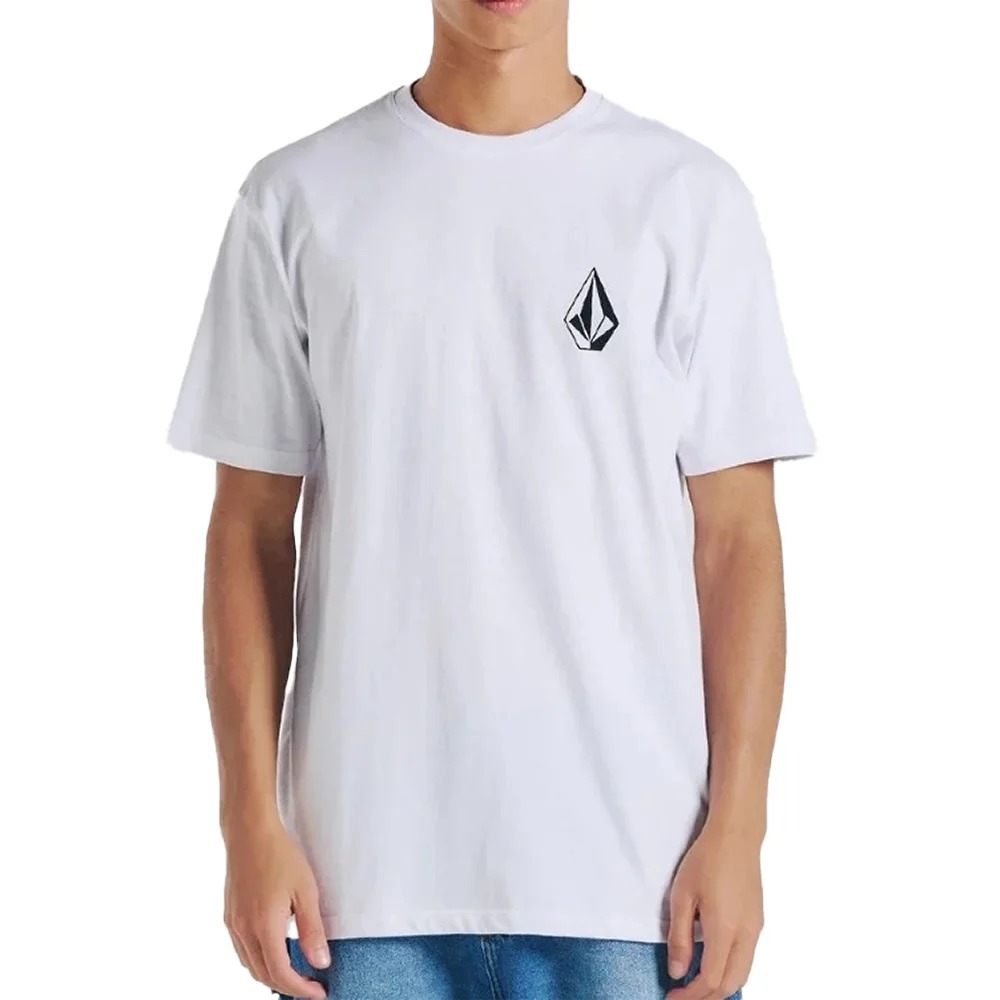 Camiseta Volcom feita em modelagem regular, meia malha 30.1, silk frontal, assinatura Volcom na manga, etiqueta interna e viés contrastante.
