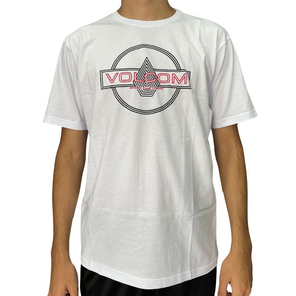 Camiseta Volcom feita em modelagem regular, meia malha 30.1, silk frontal, assinatura Volcom na manga, etiqueta interna e viés contrastante.