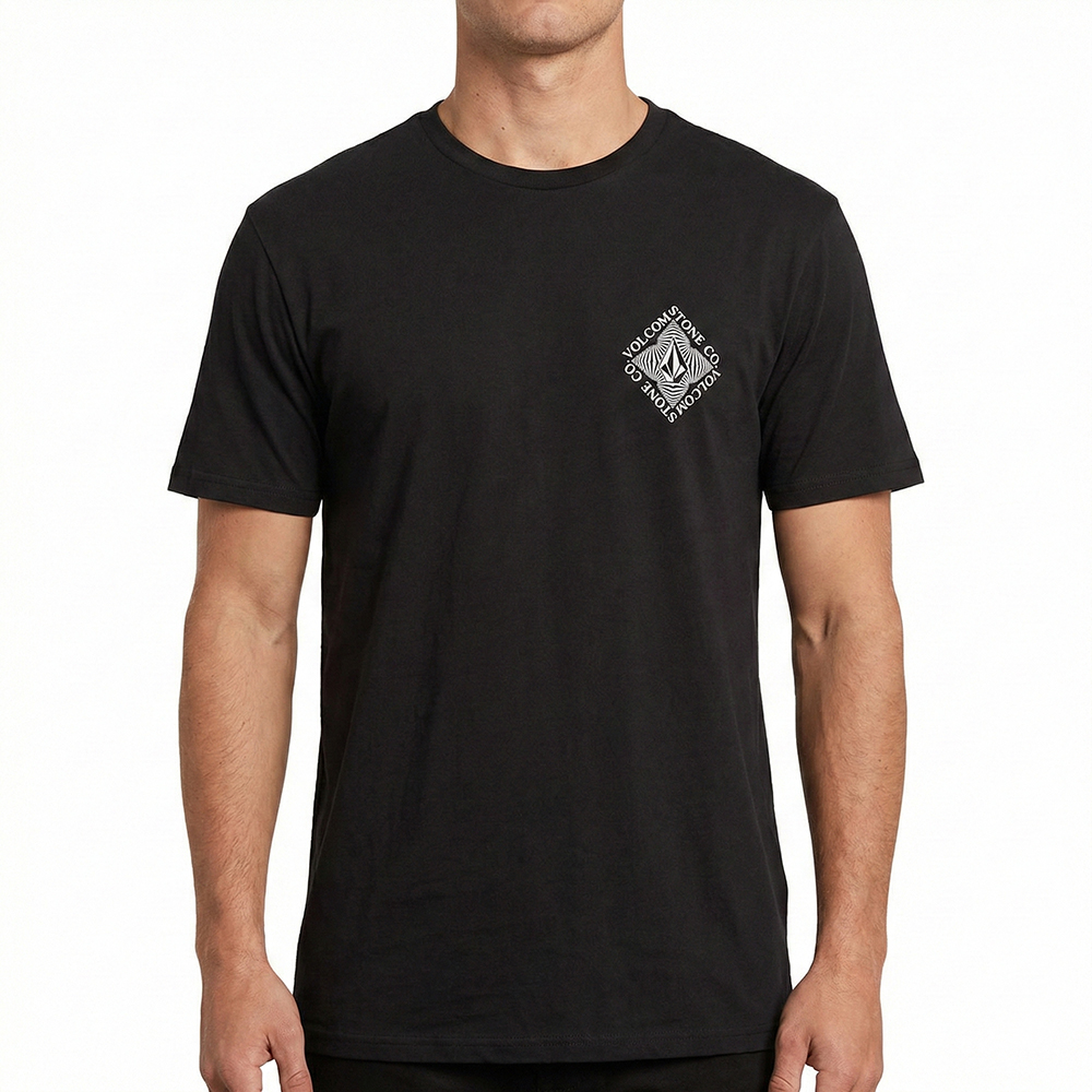 Camiseta Volcom feita em modelagem regular, meia malha 30.1, silk frente e costas, assinatura Volcom na manga, etiqueta interna e viés contrastante.