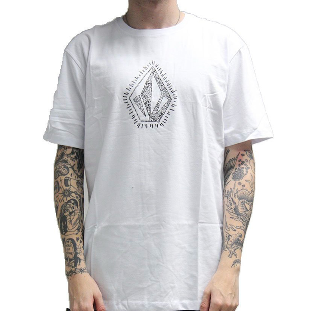 Camiseta Volcom feita em modelagem regular, meia malha 30.1, silk frontal, assinatura Volcom na manga, etiqueta interna e viés contrastante.