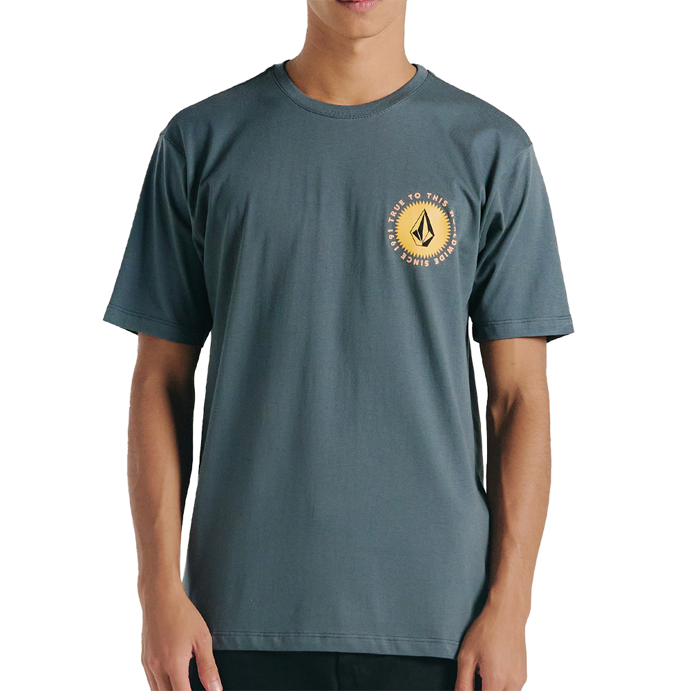 Camiseta Volcom feita em modelagem regular, meia malha 30.1, silk frente e costas, assinatura Volcom na manga, etiqueta volcom e viés contrastante.