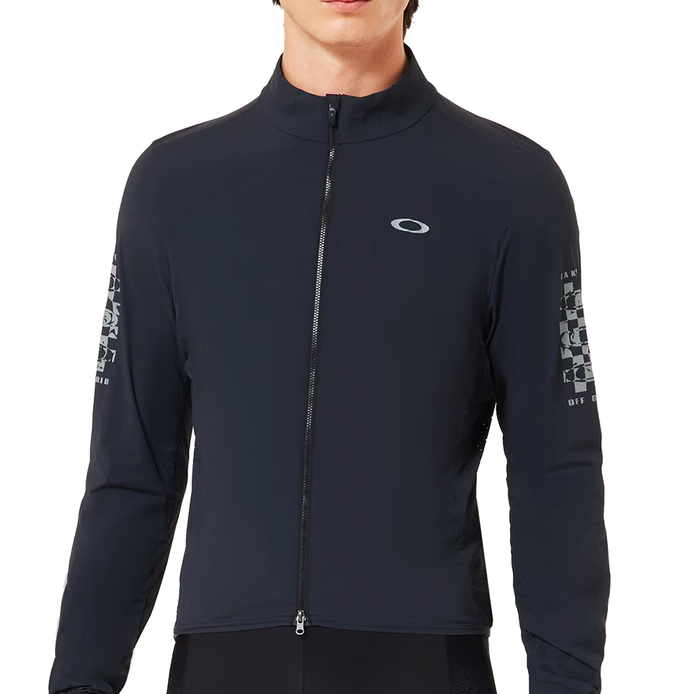 Jaqueta Oakley feita em materiais superleves e altamente compactáveis para minimizar o volume quando guardados, bolso compactável na parte de trás com puxador de zíper reversível, revestimento repelente à á gua durável, zíper autotravante com a marca YKK, puxador de zíper duplo, estampa de tranferência de elipse Oakley no peito esquerdo, gráficos Oakley Off Grid nas mangas e nas costas, orifícios de laser estrategicamente posicionados nos painéis laterais fornecem resfriamento direcionado, acabamento elástico nos punhos e na bainha e bainha posteior caída.