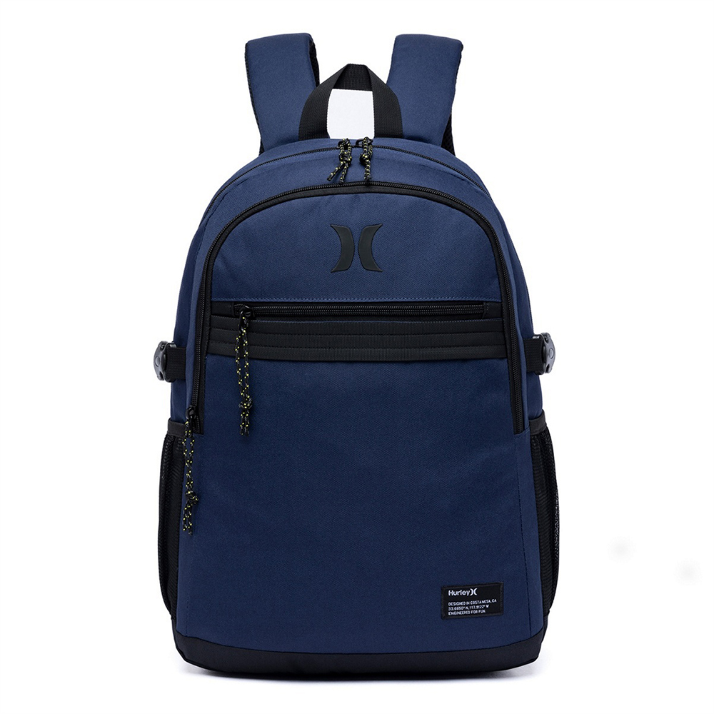Mochila Hurley com compartimento principal, compartimento frontal, logo bordado frontal, alças ajustáveis e etiquetas personalizadas.