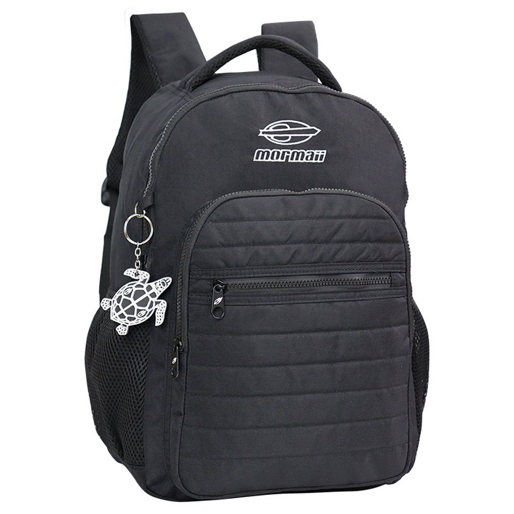 Mochila Mormaii com alças acolchoadas, alça manual reforçada, costas acolchada reforçada, costura dupla reforçada e etiquetas personalizadas.